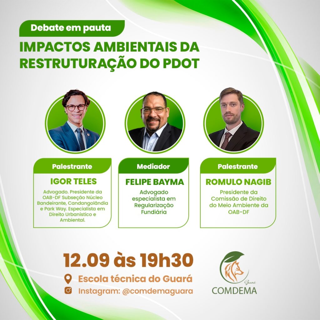 O Plano Diretor de Ordenamento Territorial está em fase de recolhimento de sugestões junto às comunidades pelo Governo do Distrito Federal. Já se sabe que, possivelmente, só entrará em pauta na CLDF em 2024. Por isso a Comissão em Defesa do Meio Ambiente do Guará, prepara um grande debate de ideias e sugestões dos moradores para apresentar ao governo. A palestra com nomes renomados da OAB-DF, acontecerá no próximo dia 12/09, às 19h30, na escola Técnica do Guará.